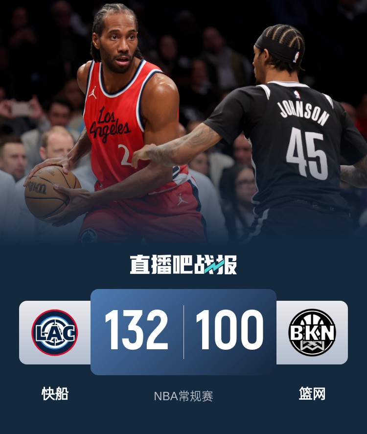比赛上来,篮网就利用火热的外线手感取得领先,快船虽然紧咬比分却始终未能完成反超,次节莱昂纳德突然爆发,单节轰下19分,快船也在他的带领下单节攻下42分净胜21分,半场结束时篮网已经落后20分;下半场回来,快船依旧攻势如潮,分差也是突破了三十分,末节比赛早已失去悬念,最终快船大胜篮网,送给后者六连败。