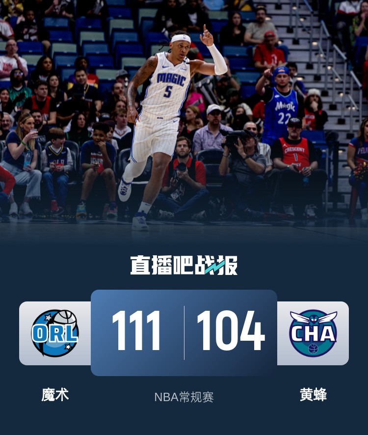 开场后班凯罗和小瓦格纳联手帮助魔术打出攻势,黄蜂进攻状态不错紧追不舍。第二节上来休斯坦外线连中三分扩大优势,小瓦格纳也继续砍分,虽然黄蜂多点开花努力追分,但魔术在半场结束时依旧手握10分优势。易边再战,魔术进攻效率下降,黄蜂在鲍尔的带领下一路追上比分,最后一节两队依旧打得难舍难分,场上比分也是多次打平,最后时刻鲍尔连续出现失误,魔术连得6分再度建立领先,鲍尔因为进攻犯规犯满离场,最终魔术111-104力克黄蜂取得3连胜,黄蜂遭遇3连败。