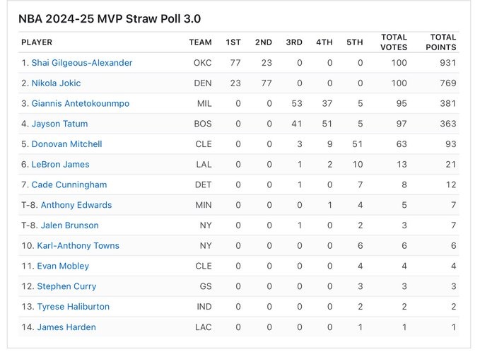4月2日讯 近日,ESPN组织了100位记者、媒体人进行了赛季第三次MVP模拟投票。亚历山大获得77张第一选票,断档领先。约基奇23张第一选票,位居第二。字母哥总得分第3,塔图姆第4,詹姆斯第6,库里第12,哈登第14。
