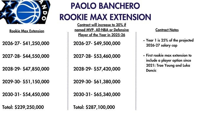 如果班凯罗下赛季解锁MVP、DPOY和最佳阵容中的任何一项,那么他的合同是5年2.87亿,细节如下: