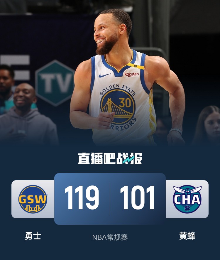 开场后勇士率先在外线找到手感,波杰姆斯基和库里先后命中三分打出攻势建立领先,萨隆扮演奇兵替补登场后独中三记三分为黄蜂吹起反击号角。第二节上来鲍尔也进入状态接连追分,格林内突外投为勇士稳住局面,随后勇士防守奏效连续打出反击又将分差拉大到两位数,布里奇斯表现神勇单节15分带领黄蜂追分。易边再战,两队依旧围绕10分左右拉锯,鲍尔带队掀起反扑,库里站出来连续得分回应,追梦格林一次恶意犯规让黄蜂一回合拿了7分再度迫近比分,希尔德和巴特勒各中三分再度稳住局面。第四节上来波杰姆斯基和希尔德又是连中三分,场上分差被继续拉大,虽然黄蜂最后又追回一些分数,但分差还是在两位数。最终勇士119-101轻松击败黄蜂升到西部第六,黄蜂遭遇7连败。