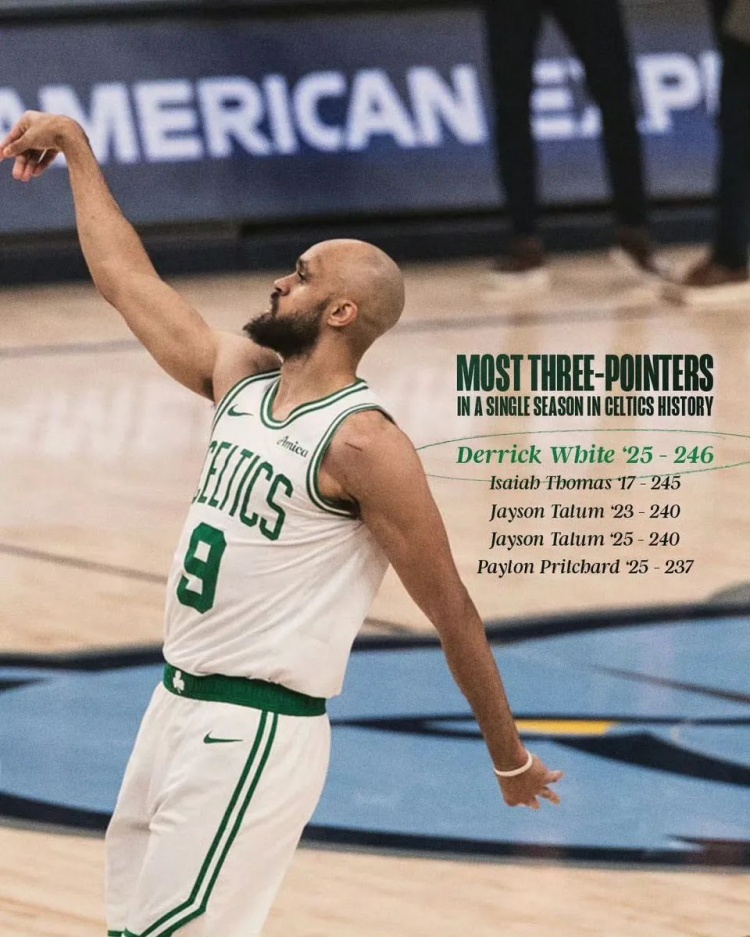 德里克·怀特今天射中本季第247个三分球,凯尔特人队史记录。三年前此时他到凯尔特人时,在马刺四年半进了300个三分球,命中率34%。在凯尔...