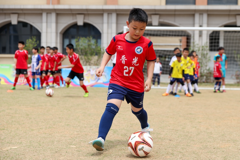 学生代表与嘉宾合影留念后,足球互动活动正式开启。在福建泉州青工足球俱乐部专业球员的带领下,小球员们进行了热身运动,为接下来的挑战做好准备。盘带接力大挑战中,小球员们带球穿梭在障碍物间,展现出扎实的球技和顽强的斗志;金球模式的足球友谊赛更是紧张刺激,每一次进攻都扣人心弦,现场欢呼声、加油声此起彼伏。