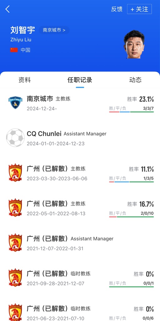 刘智宇出生于1985年,曾在广州恒大一线队和青年队担任教练多年,也曾为国家队和国青队工作。他自2024年12月担任南京城市主帅,带队至今取得3胜3平7负的战绩,胜率为23.1%。南京城市近期遭遇3连败。