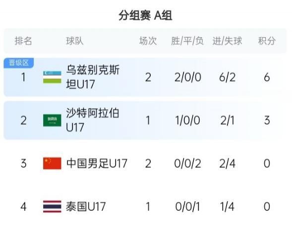 4月7日讯 U17亚洲杯小组赛A组第2轮,U17中国男足1-2乌兹别克斯坦U17,两轮0分。积分榜方面,乌兹别克斯坦提前晋级,而中国男足U17仅剩理论...